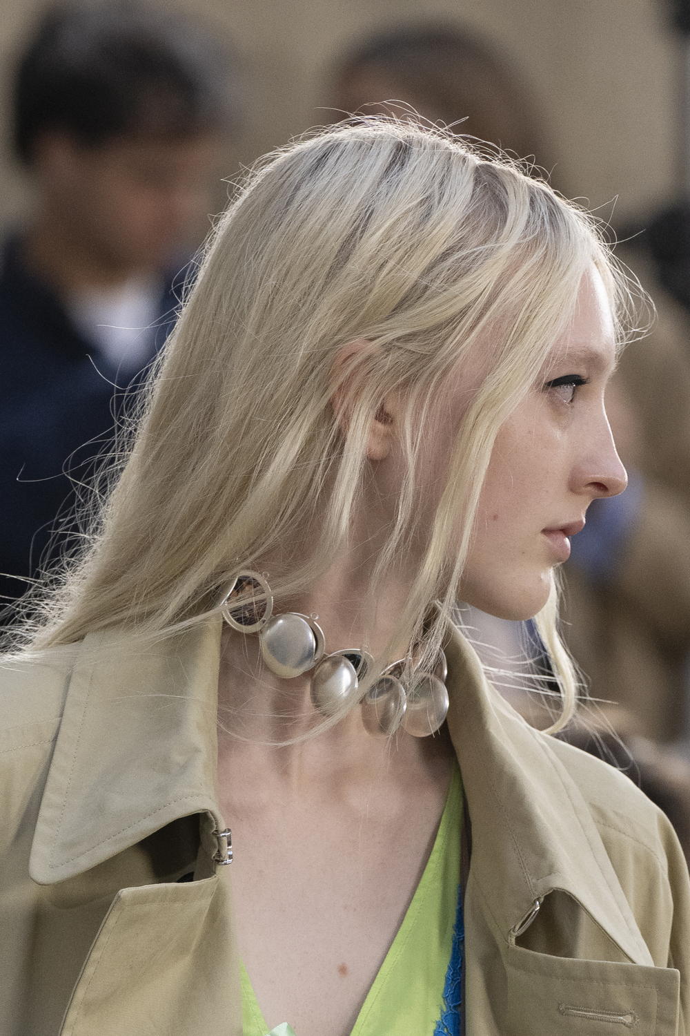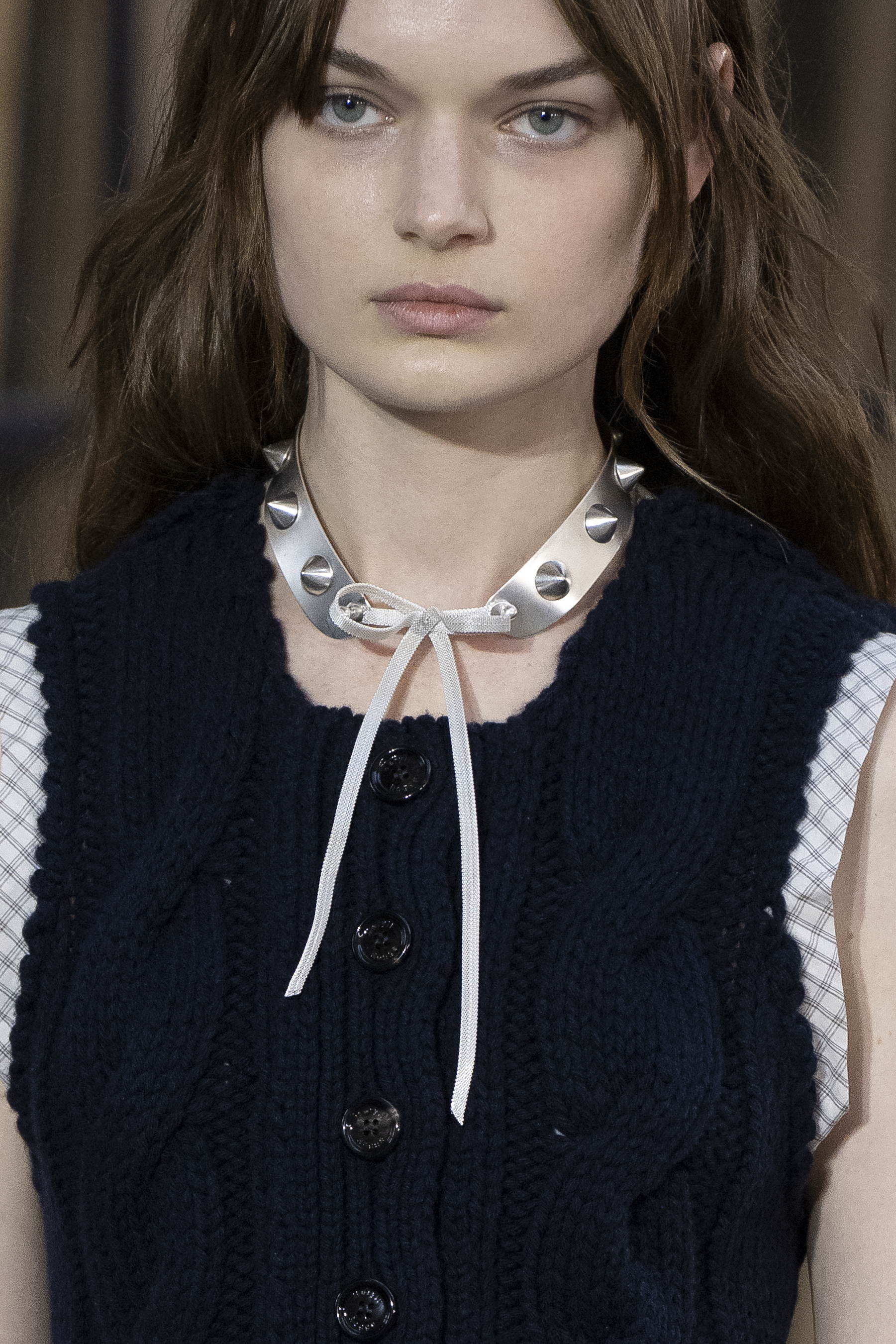Wouters & Hendrix a créé des bijoux de défilé qui correspondent à cet esprit : audacieux sans complexe, jouant sur la tension entre les perles délicates et les formes massives, dans les tons argentés frais des nuits au clair de lune. Les boucles sont omniprésentes, leur essence étant la possibilité d'évasion qu'elles encerclent. La beauté belliqueuse des clous parfaitement sphériques, placés avec une précision mathématique sur du métal maillé, évoque une aura étrangement protectrice. Le thème de la mémoire traverse toute la collection : si toutes les pièces visent à être inoubliables, certaines servent littéralement de supports de mémoire, de moyens de garder les êtres chers disparus près du corps vivant.