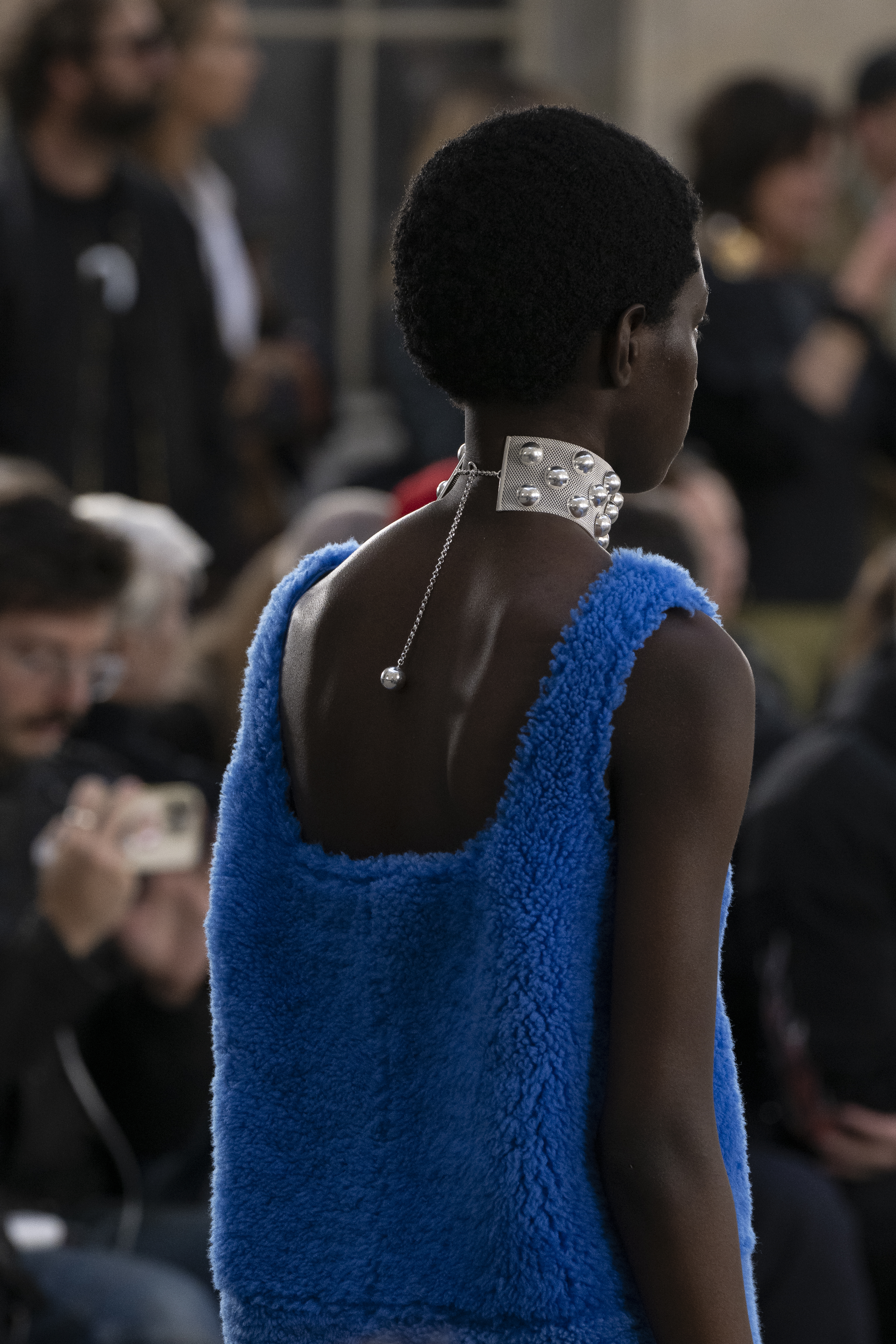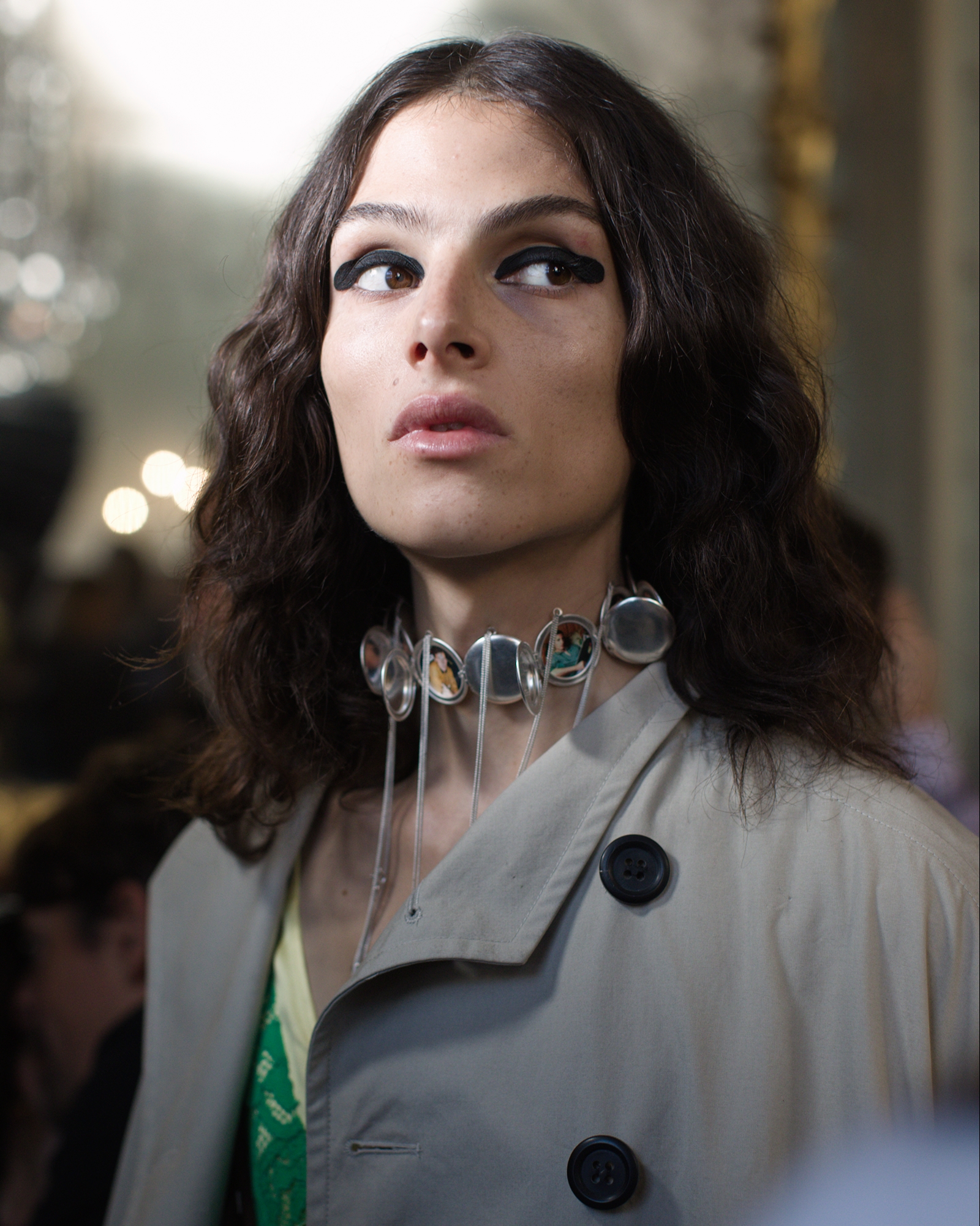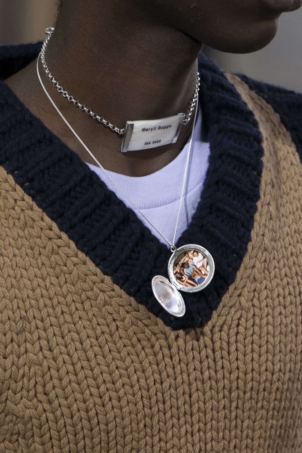 Wouters & Hendrix creëerden runway-juwelen die bij deze geest passen: onbeschaamd gedurfd, spelend met de spanning tussen delicate parels en grove vormen, in de koele zilveren tinten van maanverlichte nachten. Lussen zijn overal aanwezig, met als essentie de mogelijkheid tot ontsnapping die ze omringen. De strijdlustige schoonheid van perfect bolvormige studs, met wiskundige precisie geplaatst op metalen gaas, roept een vreemd beschermende uitstraling op. Door de collectie loopt een thema van herinnering: hoewel alle stukken bedoeld zijn om onvergetelijk te zijn, dienen sommige letterlijk als dragers van herinneringen – manieren om geliefden en verloren dierbaren dicht bij het levende lichaam te houden.